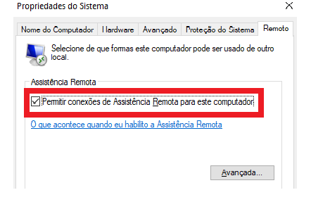4 - Clique na aba Remoto e habilite a opção: Permitir conexões de Assistência Remota para este computador.